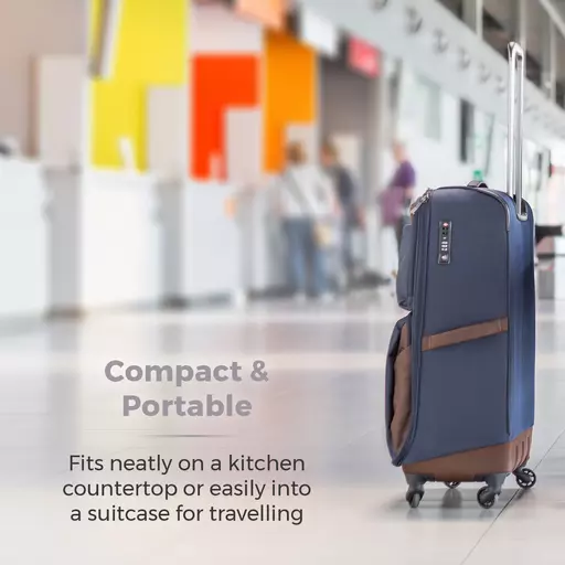Measuring at just H21.3 x W22 x D15cm, its compact size fits neatly on your kitchen countertop or easily into a suitcase, backpack or luggage case so you can make hot drinks while travelling or on holiday