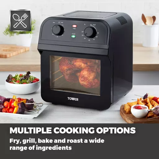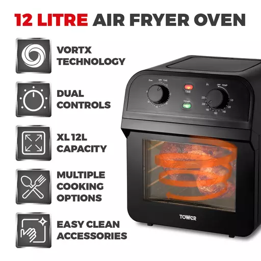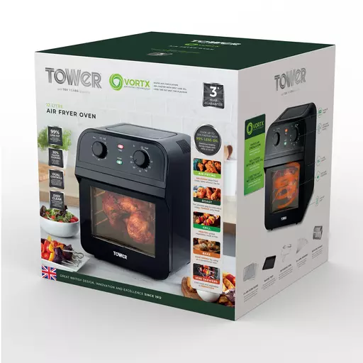 Fry, roast, grill or bake your way to deliciously healthy meals with the Tower Vortx 12L Air Fryer Oven. Utilising Vortx technology, the hot air rapidly circulates evenly ensuring your ingredients are cooked thoroughly with a crispy texture. Little to no oil is required, all while keeping the same great taste, so you lose the fat not the flavour. Packed with a powerful punch it cooks food 30% faster than a conventional oven, with 500g of fries ready to eat in under 20 minutes. The extra-large 12L capacity gives you up to 75% more space than a standard air fryer, so you can cook more of your favourite foods all in one place. Perfect for a quick and easy dinner party with friends or feeding the whole family. The included airflow racks, baking tray, rotisserie fork, mini skewers and rotating basket are easy to clean with a simple wipe – to keep your ultimate cooking companion ready to use every meal time.