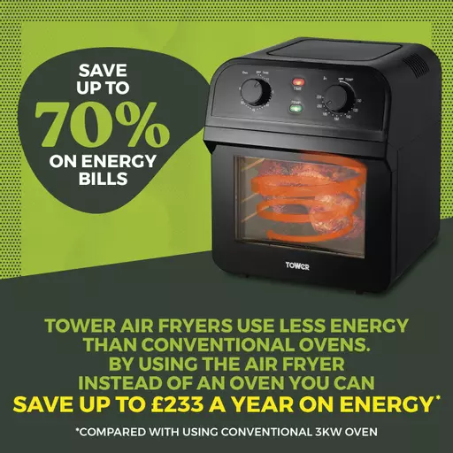 Tower Air Fryers are powerful and cook food much faster than conventional ovens, yet they also use far less energy. Save up to 70% on your energy by simply switching to Tower Air Fryer cooking, which could reduce your energy bills by £233 per year