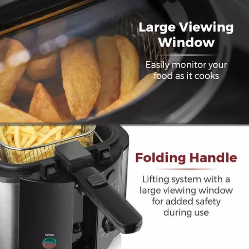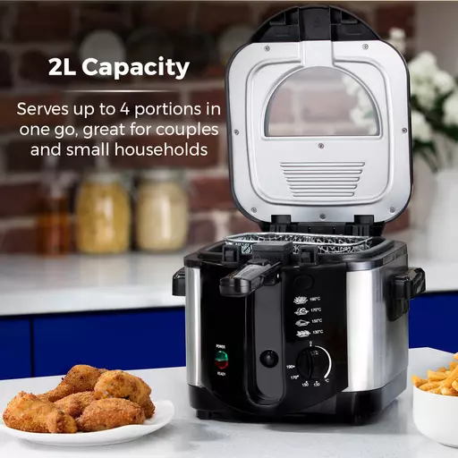 Traditional chip shop-style food is made easy using this 2L Deep Fat Fryer. It delivers accurate results with its adjustable thermostat, allowing you to control the temperature to cook your ingredients to perfection every time. The 2L frying basket serves up to 4 portions of fluffy homemade chips, crispy chicken, tempura vegetables, nutritious fish, delicious doughnuts and more in one go, great for couples and small households. Its large viewing window lets you easily monitor your food as it cooks, while the folding handle and lifting system allow you to lift the basket out of the oil without needing to open the lid for safer handling.