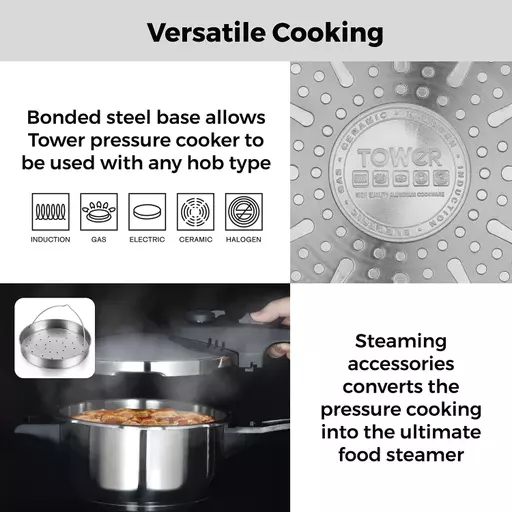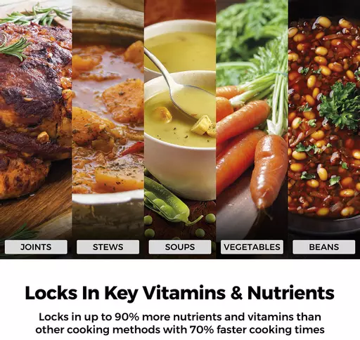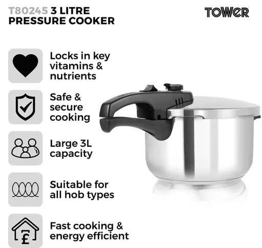 Tower pressure cookers locks in up to 90% more vitamins and nutrients than other cooking methods while retaining rich flavours and succulent textures. Â Perfectly cook a wide variety of foods including joints, stews, soups, vegetables, beans and so much more!