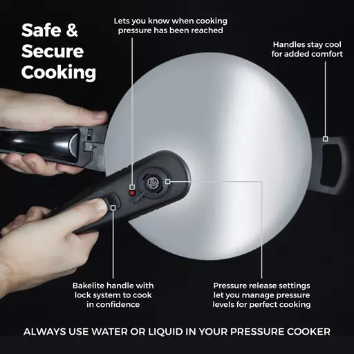Always use water in your pressure cooker. A simple pressure indicator valve lets you know when cooking pressure has been reached whilst the easy to use 2 pressure release settings allows the pressure to be adjusted dependent on what food is being cooked. Â Tower pressure cookers come complete with an ultra-tough Bakelite handle with lock system to ensure complete control during cooking. Â The lock system also prevents the lid from being opened when the contents are under pressure. The side handles stay cool, allowing for comfortable handling.