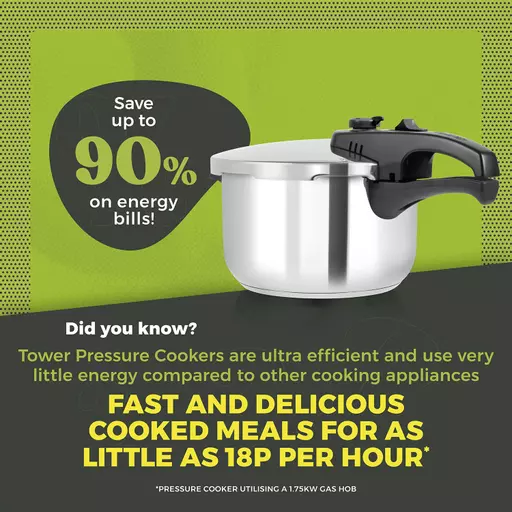 Because steam is infused into the food using pressure, cooking times are up to 70% quicker than other cooking methods. Â With reduced cooking time comes reduced energy consumption and Tower pressure cookers cost just 18p to run per hour when used with a 1.75kw gas hob