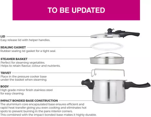 Inject a wealth of healthy eating into your home with the 3 Litre Stainless Steel Pressure Cooker. With a compact capacity and 20cm diameter, this pressure cooker is ideal for cooking delicious meals and maintains more vitamins and nutrients during cooking for healthier meals. Â The aluminium and steel capsulated base ensures for rapid and more evenly cooked food as well as a hassle-free clean for easy maintenance. The phenolic side handles offer a comfortable grip during use and the choice of 2 easy-to-use pressure settings allow you to create your own homemade dishes at different pressure levels. The included steamer basket is ideal for steaming fish, meats and vegetables for a low fat method of cooking.