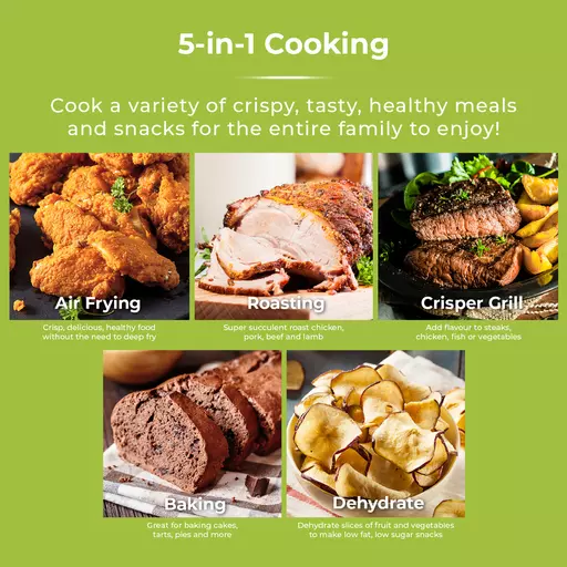Fry, roast, grill or bake your way to deliciously healthy meals with the Tower Vortx 5.6L Air Fryer and Grill with Crisper. Utilising Vortx technology, the hot air rapidly circulates evenly ensuring your ingredients are cooked thoroughly with a crispy texture. Little to no oil is required, all while keeping the same great taste, so you lose the fat not the flavour. Packed with a powerful punch it cooks food 30% faster than a conventional oven, with 500g of fries ready to eat in under 20 minutes.