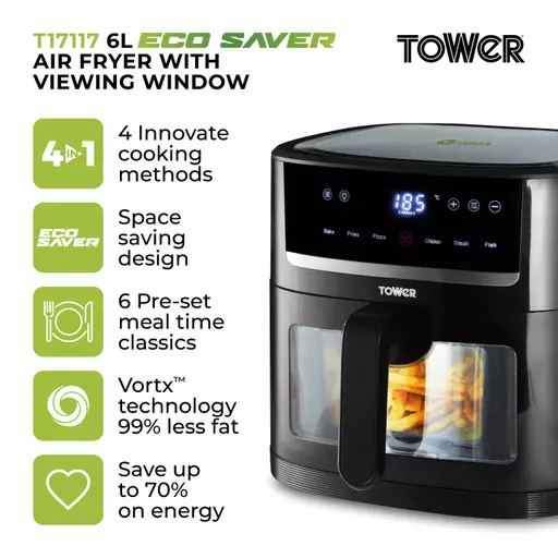 Take the fuss out of cooking with the 6L Vortx Eco Saver Air Fryer from Tower. The compact design ensures easy storage whilst still giving the flexibility to cook large, healthy meals with ease.