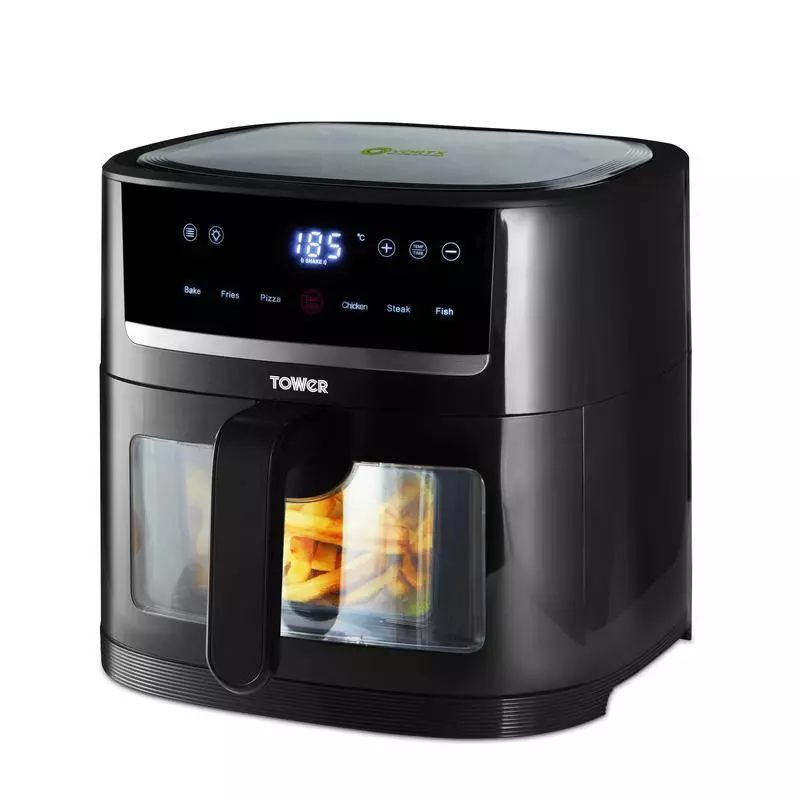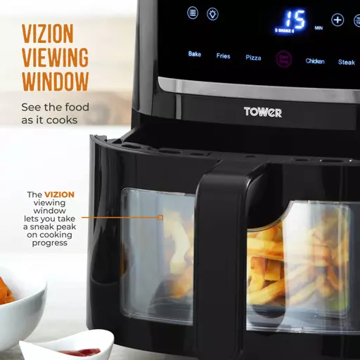 Exclusive to Tower Air Fryers, Vortx technology rapidly circulates hot air around food. Cooking up to 30% faster than a conventional oven and using 99% less oil, allowing you to save up to 70% on your energy. The large Vizion viewing window with built-in internal lights give you the freedom to monitor your food wihout having to open the drawer & extending the cooking time & energy usage as a result. Due to the smaller design, there is less packaging required, creating a more eco-friendly device without losing any cooking power. The air fryer boasts a generous 6L capacity so you can still make light work of family meals, cooking large quantities with minimal fuss. Non-slip feet keep the device safely and securely on the counter, whilst the 90cm power lead lets you put the fryer wherever you like on your countertop