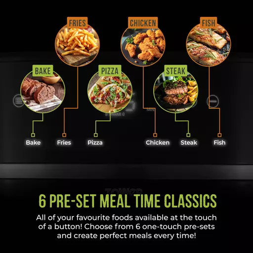 | 6 Pre-set menu options. Fries Bake Pizza Chicken Steak Fish | Smart LED touch panel with Digital display |