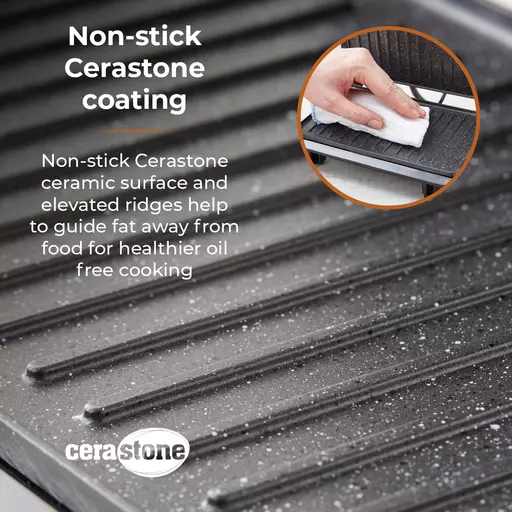 Double sided non-stick Cerastone coated ridge plates are easy to clean, and provide fast grilling on both sides with little to no oil needed, the ridged design also means that any excess fat easily drains away for healthier cooking.