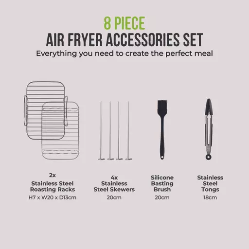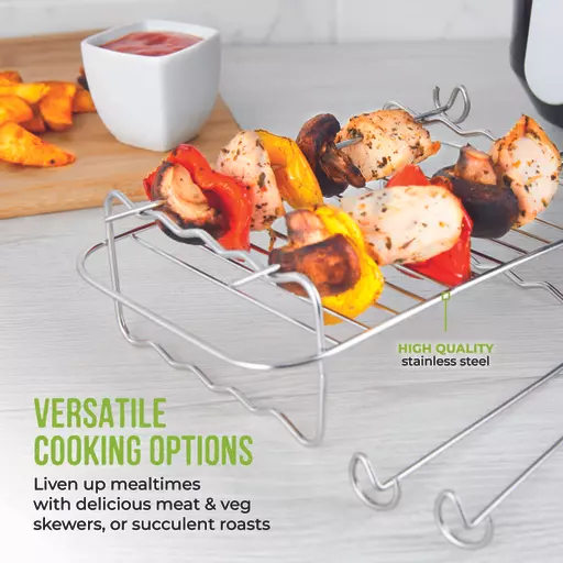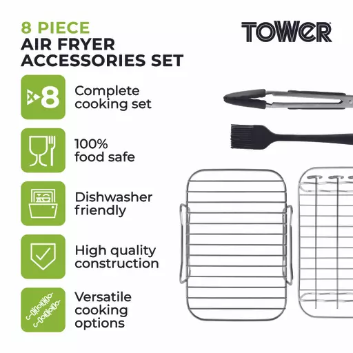 This 8 piece accessory set from Tower offers great cooking versatility with 4x stainless steel skewers, 2x stainless steel roasting racks, a silicone basting brush and tongs all included. The tongs offer you a greater reach so you don’t need to put your hands in the air fryer to remove food, whilst the BPA free silicone basting brush ensures you can apply marinades and sauces evenly across your food for flavoursome meals. The skewers will slide through any meat or vegetable with ease, perfect for family mealtimes, whilst the roasting racks allow you to place your rest your food on top before placing them in the fryer so hot air will circulate for a more even cook. All parts of this accessory set are dishwasher safe for simple and fuss-free cleaning.Â