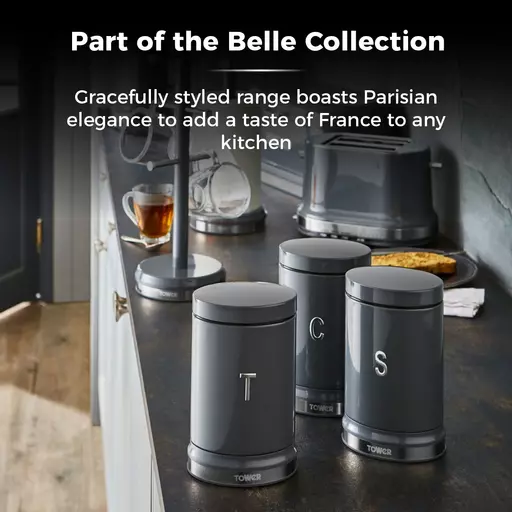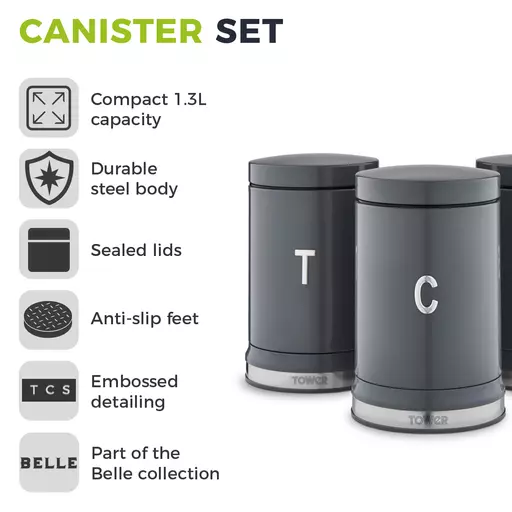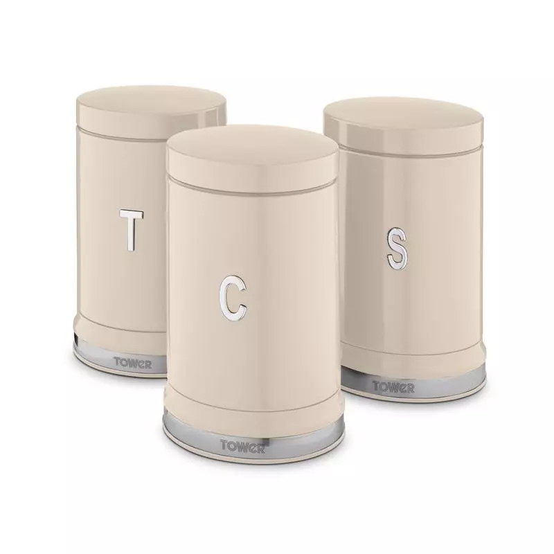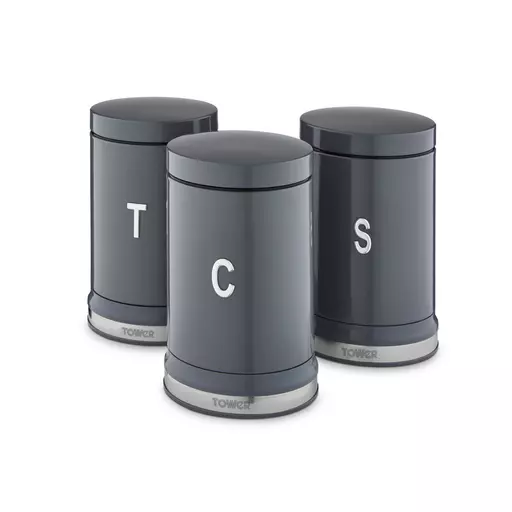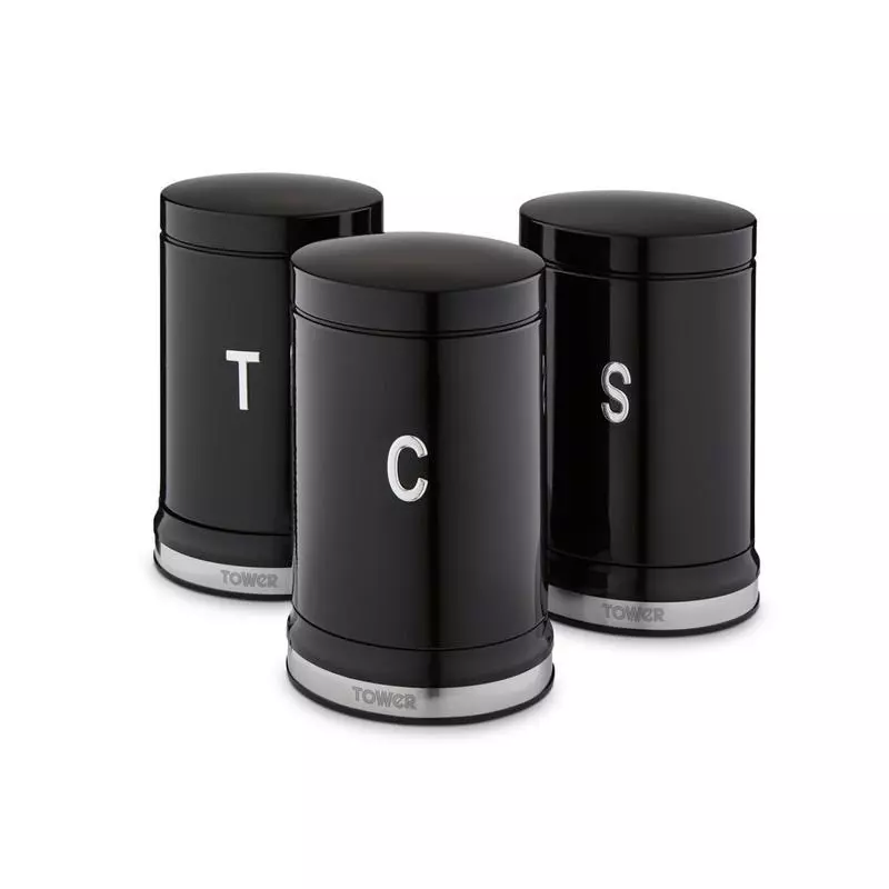 Store your loose ingredients in style with the Tower Belle canister set. The 3 containers feature a bold colourway wrapped around a sophisticated curved design to bring a touch of elegance to your kitchen. Perfect for storing cuppa essentials, the canisters are decorated with embossed T/C/SÂ chrome lettering, keeping your kitchen neatly organised with indication to the contents inside. Each canister has a 1.3 litre capacity to store up to 50 teabags, 1kg of coffee and 1kg of sugar neatly on your kitchen countertop, and its small footprint saves space too.