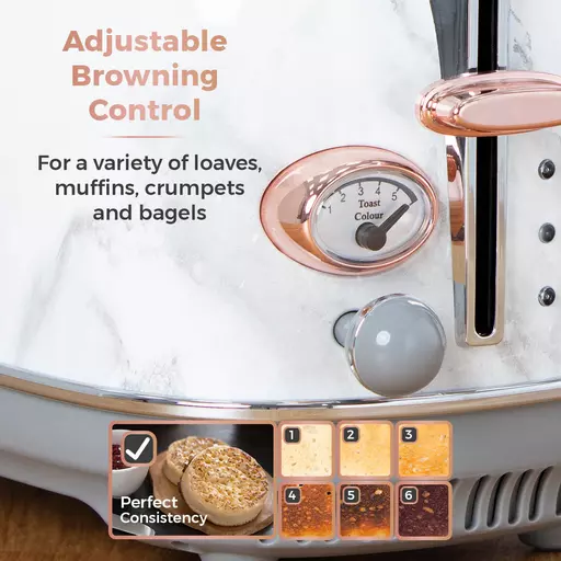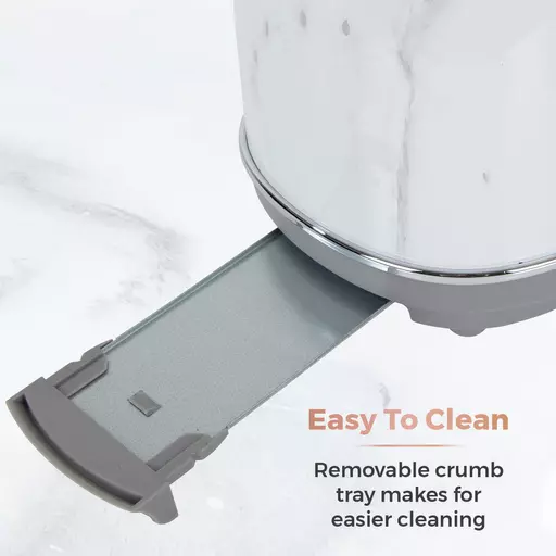 Including a removable tray for an easy clean and keeping your countertop crumb-free with a cord storage to keep surfaces wire-free. Finished with a white marble coating and rose gold accents, the Bottega toaster complements the look of your kitchen countertop.