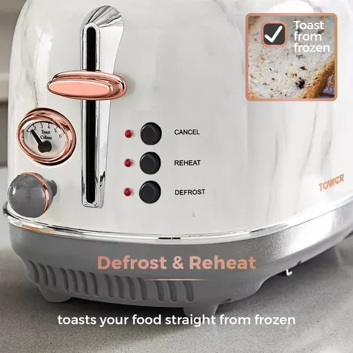 Be a toasting champion with the Tower Bottega rose gold 2 slice toaster. Featuring variable browning control that gives you precise toasting results that suits your taste. From loaves, bagels and crumpets, the self-centring function will consistently toast your items to perfection after every use. For more functionality, the toaster includes a defrost, reheat and cancel options for better control and convenience for toasting frozen snacks.