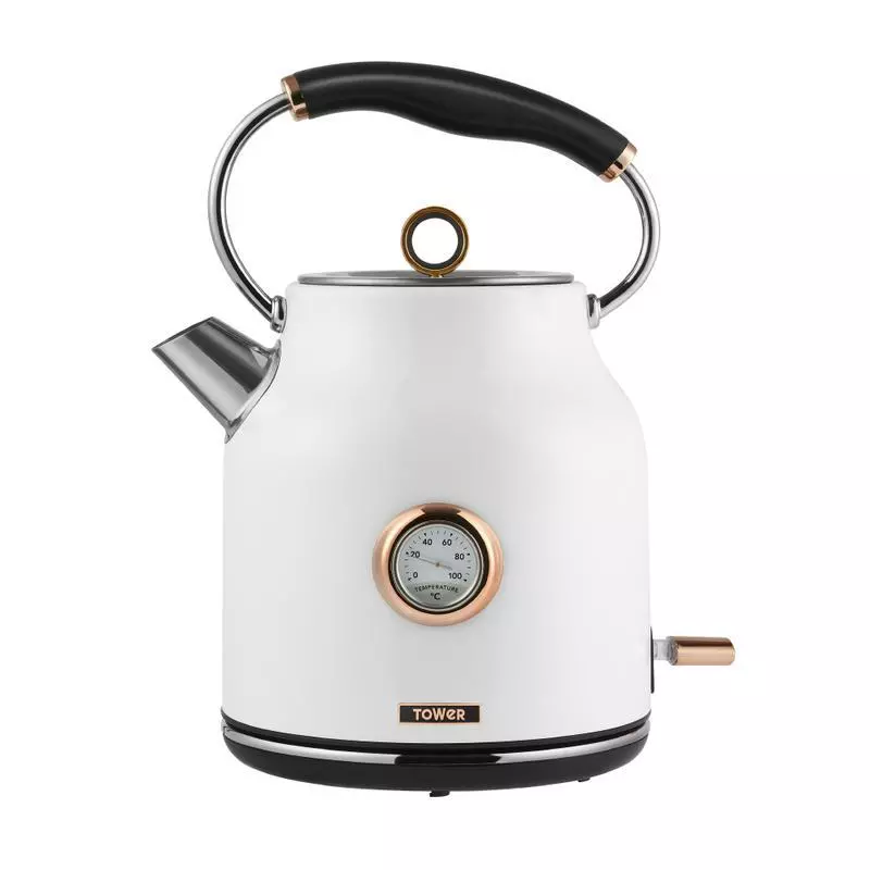 A built-in temperature gauge lets you easily monitor the boiling process so your brews are at the perfect temperature. Featuring quality stainless steel and rose gold accents, this kettle provides a subtle yet tasteful addition to your everyday kitchen appliance. Includes a removable limescale filter, which makes it easy to clean and maintain the kettle. Automatic shut-off provides added safety once the kettle has boiled.