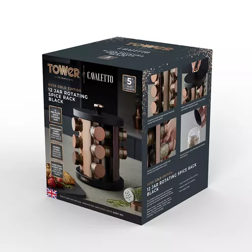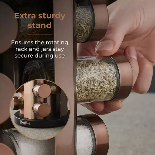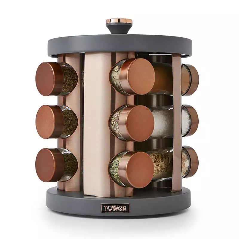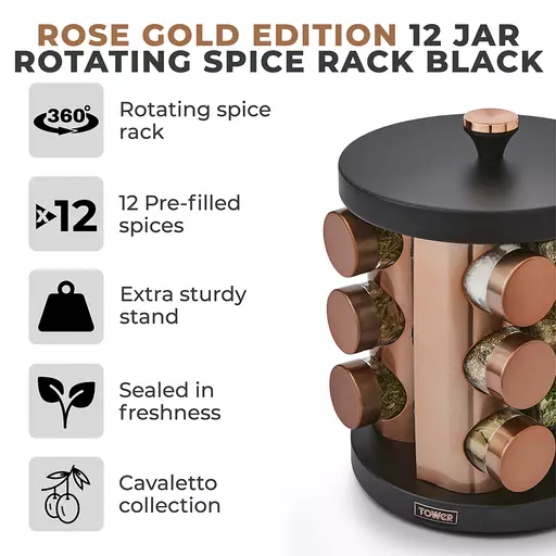 Conveniently store and access your spices while you cook with this Cavaletto 12 Jar Rotating Spice Rack from Tower. The rotating stand design provides easy access to your seasonings and saves space in the kitchen, allowing you to keep your cupboards clutter-free and your spices neatly organised on the countertop. It comes with 12 jars pre-filled with a selection of spices including coarse salt, bay leaves, rosemary, basil, parsley, oregano, fennel seeds, ground cinnamon, onion flakes, coriander, thyme and sage. A rose gold screw lid on each jar keeps the freshness sealed in for longer, while an integrated carry handle lets you easily move the rack between your surfaces as you clean. Part of the Tower Cavaletto collection, this spice rack in on-trendrose gold is perfect for elevating the look of your kitchen.