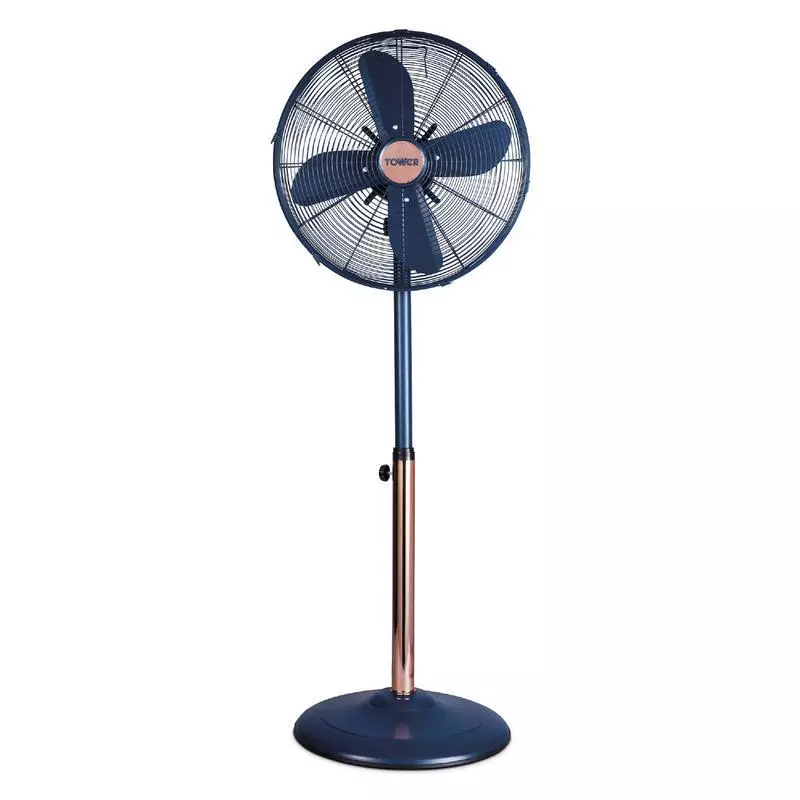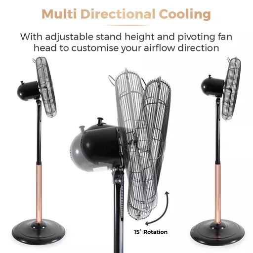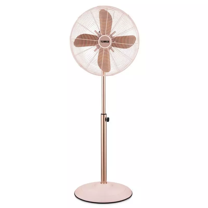 Featuring 80 degree oscillation, the fan will automatically circulate the airflow from left to right, giving you the best and most precise cooling where you need it. You can also adjust the head for multi-directional cooling. This pedestal fan includes four blades with a stylish rose gold coating, providing powerful and quality performance when in the home or office. It’s easy to assemble and features a 1.7 metre cable for added freedom to place the fan wherever you like in the room. The height can be adjusted between 93cm and 125cm. An anti-slip rubber base provides added stability, while the lightweight design makes for easy portability.Â
