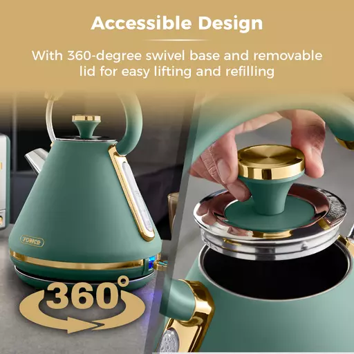 A 360-degree swivel base and fully-removable lid makes the kettle easy to lift up and refill for both left and right-handed users