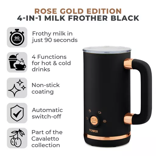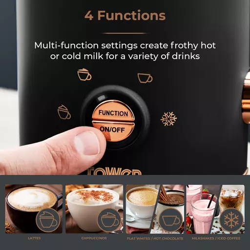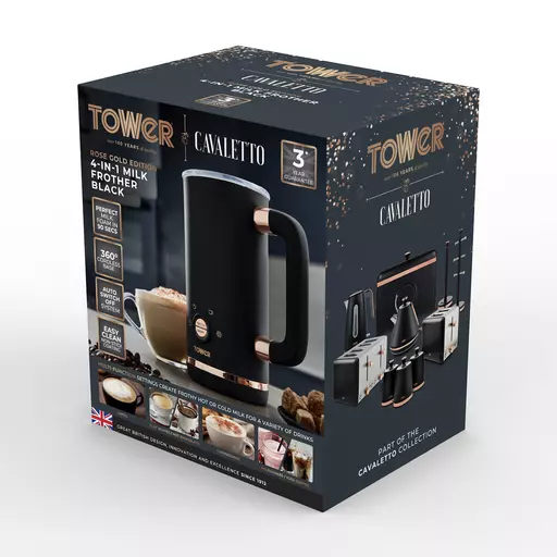 Create silky smooth hot lattes, cappuccinos, flat whites and delicious cool milkshakes using the Tower Cavaletto 500W Milk Frother. This powerful milk frother works in just 90 seconds, so you can add velvety smooth foam to your homemade barista-style coffee even quicker. Simple to use buttons allow you to easily switch between the 4 premium functions. Choose from warm thick milk froth, warm thin milk froth, hot milk with little froth or cold froth, to satisfy your own taste buds.