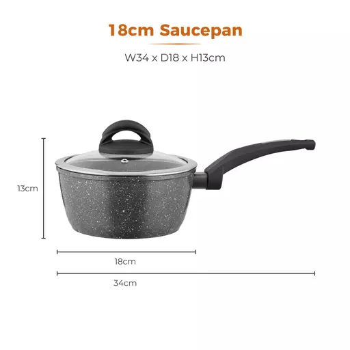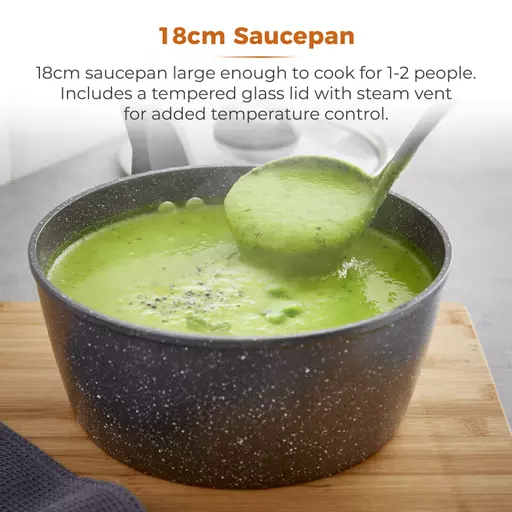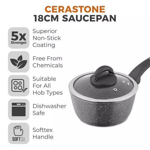 Create a wide range of delicious dishes with this Tower saucepan. Featuring a superior Cerastone non-stick coating, little to no oil is required for healthier cooking and easy cleaning. With thick forged aluminium bodies in a lightweight design, this saucepan offers all the benefits of enhanced durability whilst also enabling easy manoeuvrability around your kitchen, suitable for all users. The 18cm diameter makes it ideal for solo or family cooking, while the silicone soft touch handles offer comfort and control during use. Suitable for all hobs including induction, this pan requires only a simple hand wash to maintain its optimum performance. This Tower saucepan comes with a total of 5 years warranty, which provides added peace of mind in the event of a fault.