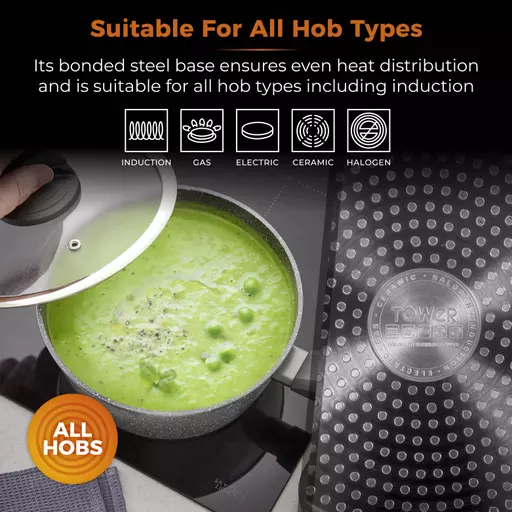 The 22cm diameter makes it ideal for solo or family cooking, while the silicone soft touch handles offer comfort and control during use. Suitable for all hobs including induction, this pan requires only a simple hand wash to maintain its optimum performance. This Tower saucepan comes with a total of 5 years warranty, which provides added peace of mind in the event of a fault.