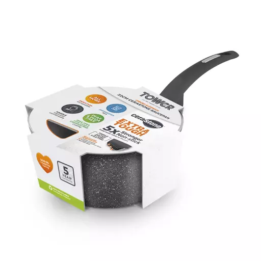 Create a wide range of delicious dishes with this Tower saucepan. Featuring a superior Cerastone non-stick coating, little to no oil is required for healthier cooking and easy cleaning. With thick forged aluminium bodies in a lightweight design, this saucepan offers all the benefits of enhanced durability whilst also enabling easy manoeuvrability around your kitchen, suitable for all users.