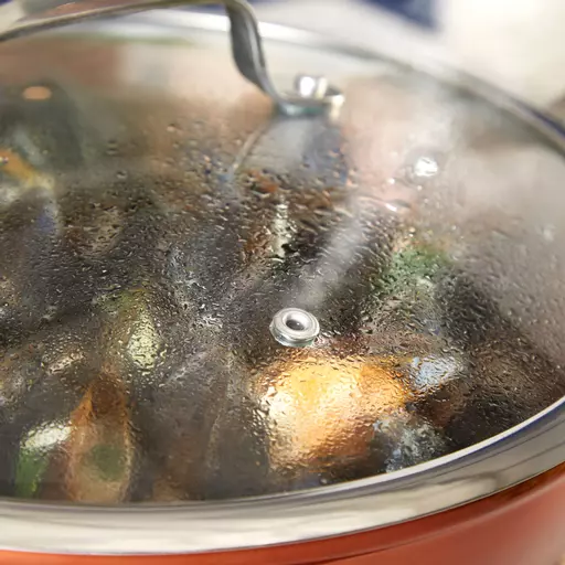 | Durable ceramic non-stick inner coating | Tempered glass lid with steam release vent |
