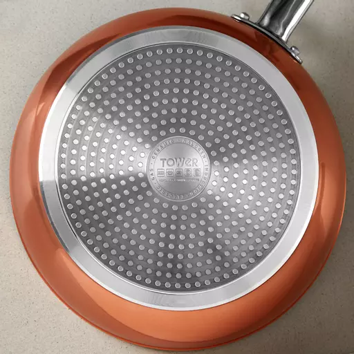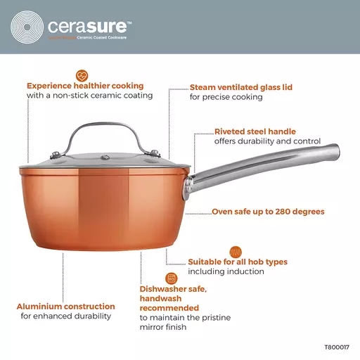 Be prepared to cook a wide variety of foods with the 3 Piece Saucepan Set, complete with an 18, 20 and 22cm saucepan. Constructed from thick forged aluminium to provide long lasting wear, this pan set features a copper mirror exterior to add a splash of style to your kitchen. These pans come complete with a ceramic non-stick coating that requires minimal to no oil for a low fat cooking alternative. The riveted stainless steel handles and bonded steel bases are compatible for use on all hob types and offer best cleaning results by performing a simple hand wash, or alternatively these pans are dishwasher friendly.