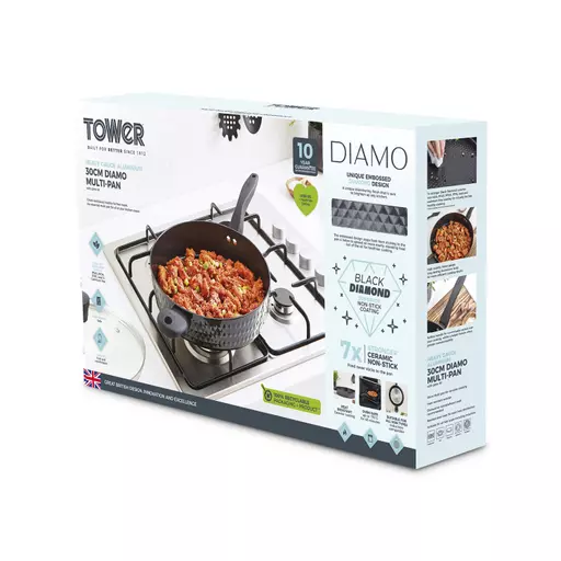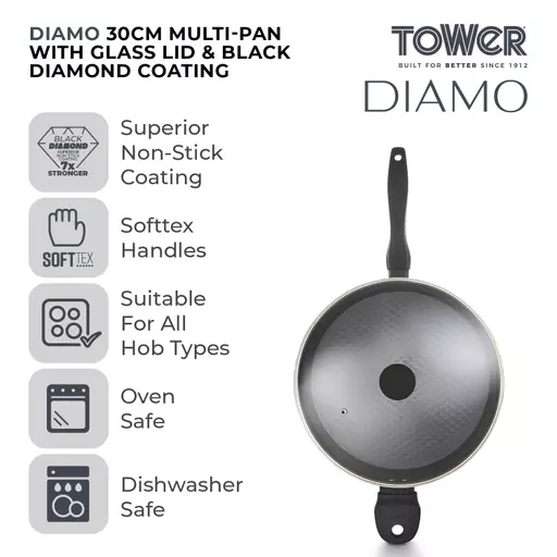 Cook deliciously sizzling fajitas and flavoursome stir-fry dishes with the Diamo 30cm Multi-Pan. Featuring high-grade non-stick technology, the Black Diamond ceramic coating is 7x stronger than other non-stick coatings, and is PFAS, PFOA, PTFE, lead and cadmium-free so you can enjoy healthy meals using little or no oil. Its high quality, long-lasting forged aluminium body enables quick and easy adjustment of temperatures for more efficient cooking results, with no hot spots. The multi-pan has a softtex handle for comfortable control over your cooking, with a tempered glass lid that helps lock in and add extra flavour to your dishes. Its bonded steel base provides even heat distribution to ensure your food is cooked thoroughly, and is designed to work with any hob type including induction. The non-stick ceramic coating prevents food from sticking to the surface, and this multi-pan is dishwasher safe for an even easier clean after cooking.Â