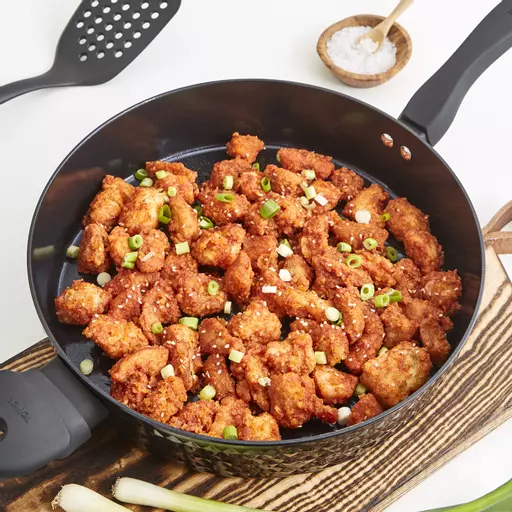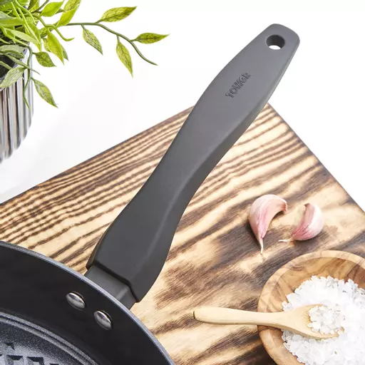 The embossed diamond design offers a unique aesthetic appeal, with a shimmer that is sure to brighten up any kitchen. The embossed design stops food from sticking to the pan & helps to spread oil more evenly, elevating food out of the oil for healthier, more flavoursome cooking.