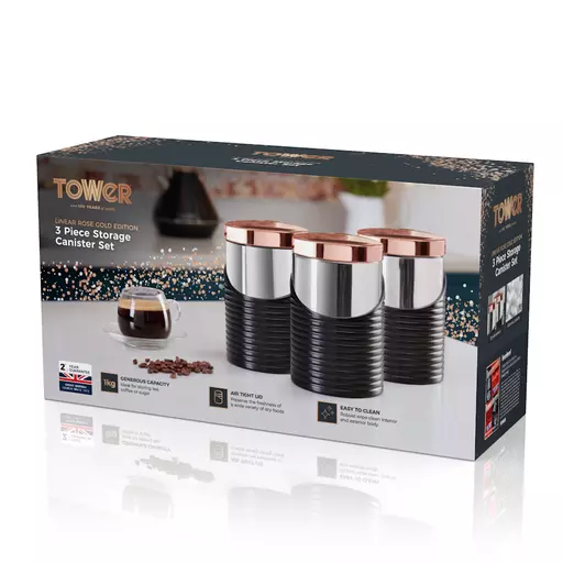 | Part of the TOWER LINEAR Rose Gold collection | Set of 3 canisters ideal for storing coffee sugar and tea |