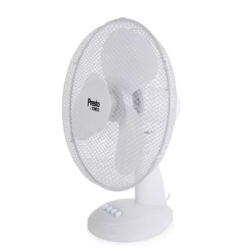 Effectively cool the air around you with this Tower Presto 16 inch 40W desk fan. Choose from up to three adjustable speed settings -low, medium or high ??? and get the perfect current of cool air that suits you. The fan head features an adjustable vertical tilt and rotary 80?? oscillation, so you can pivot and position the airflow across a wider angle to efficiently cool different areas of the room. The white structure is supported by a stable base, with non-slip grips to enhance stability across flat surfaces. It is lightweight and includes an integrated handle, which makes it easy to carry the desk fan to other rooms.