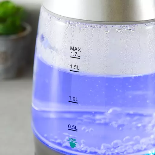 Its stylish glass body with blue LED light illuminates as the water heats up, bringing contemporary style to any kitchen.Â