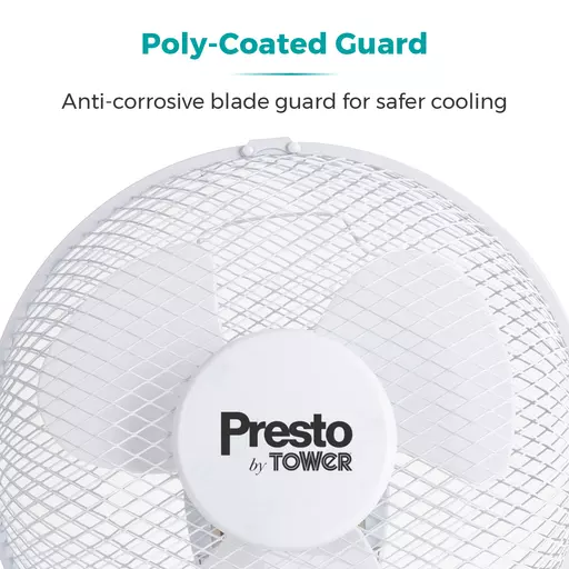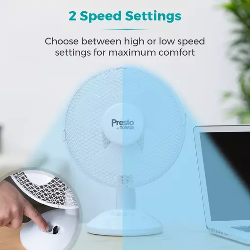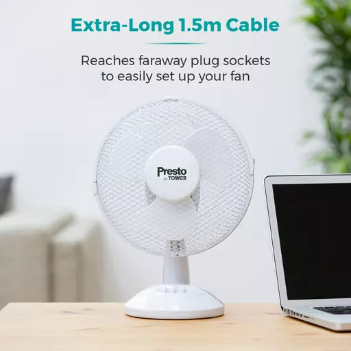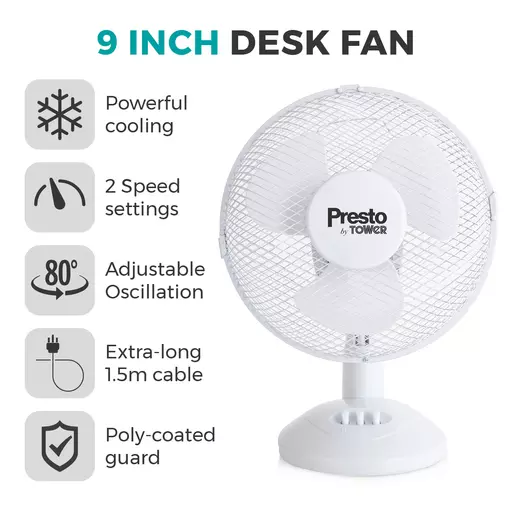 Quickly cool down your home or office space with this Tower Presto 9??? Desk Fan. It produces powerful cold air and efficiently circulates it through your surroundings to keep you comfortable when the weather heats up. Select between high or low settings for the optimal amount of airflow, with adjustable vertical tilt and 80-degree rotary oscillation ensuring the cold breeze always reaches the right spot. It comes with an extra-long power cable, letting you choose the perfect place in your room to cool off. Its anti-slip feet provide stability across any surface, with an anti-corrosive blade guard for added safety. The desk fan is simple to set up and includes a carry handle for easily carrying between rooms.