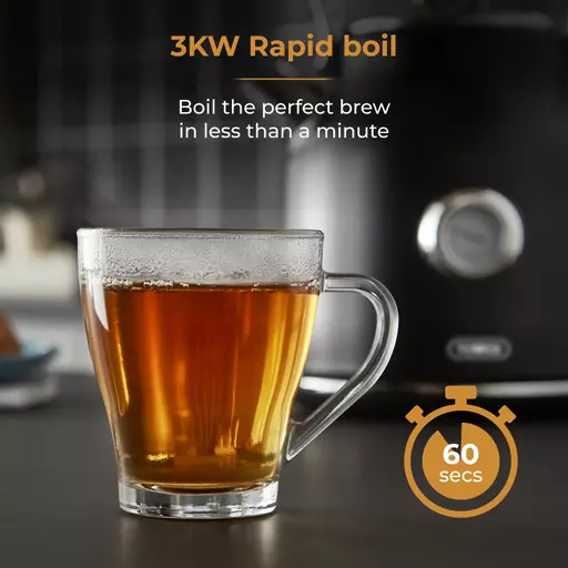Boil the perfect brew in less than a minute with the Tower 3KW Black Kettle. The 1.7L capacity lets you make up to 7 cups of tea or coffee from one fill, perfect when hosting your family and friends. Designed to prevent messy spills when making your brew, the perfect pour and easy fill spout makes for a more convenient all-round kettle. Keep the cuppas flowing without any distraction using the kettle’s quiet boil function -ideal for morning brews when you’re trying not to wake the family. The stylish design of this kettle will make a statement on your kitchen countertop, adding a touch of class to your electrical appliances and fits perfectly with the Tower Renaissance Black 2 Slice Toaster.
