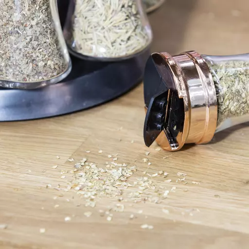 | Rose gold screw lids keep spices fresh | Sturdy stand with easy placement of jars |