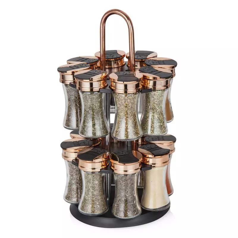 | Rose gold rotating spice rack with carry handle | Pre-fill glass storage jars with choices of 16 spices |