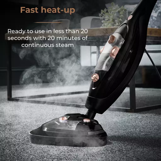 Effortlessly remove stubborn dirt and stains with the combined cleaning power of this Multi-Functional 10-in-1 Steam Mop. It uses powerful steam and detergent to eliminate up to 99.9% of harmful household bacteria, leaving surfaces sparkling clean and smelling fresh. Its high-performance motor has the mop steam-ready in less than 20 seconds, producing enough steam to clean continuously for up to 20 minutes from a single fill of water.