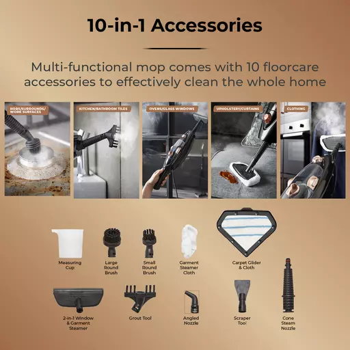 Multi-functional cleaning with 10 accessories for tackling grease, grime and dirt on tiles, carpets, hard floors, hobs, ovens, windows and upholstery. Tools include a measuring cup, large round brush, small round brush, garment steamer cloth, carpet glider, 2-in-1 window & garment steamer, angle nozzle, scraper tool, grout tool and cone steam nozzle