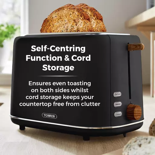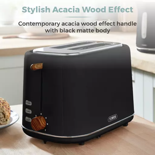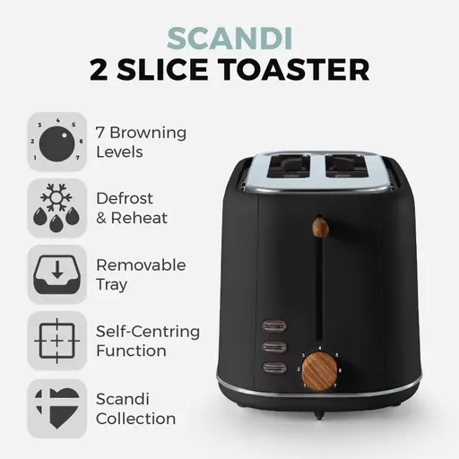 Enjoy your breakfast in Scandinavian style with the 2-slice Scandi toaster from Tower. Representing Nordic design, its contemporary coloured body with wood effect handles will easily compliment any kitchen. The toaster features 7 toasting settings so you can adjust to meet your browning needs, with a self-centring function so your toast or muffins are cooked consistently.