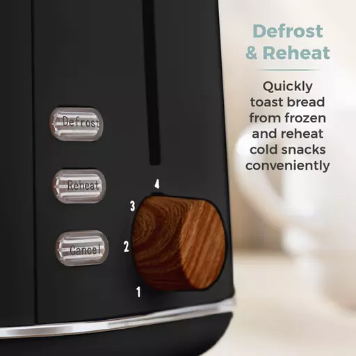 Multi-functional toaster with defrost, reheat and cancel function allows you to toast straight from frozen or warm up a quick snack.