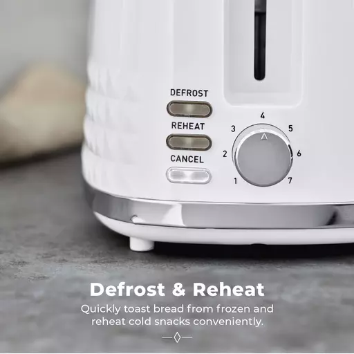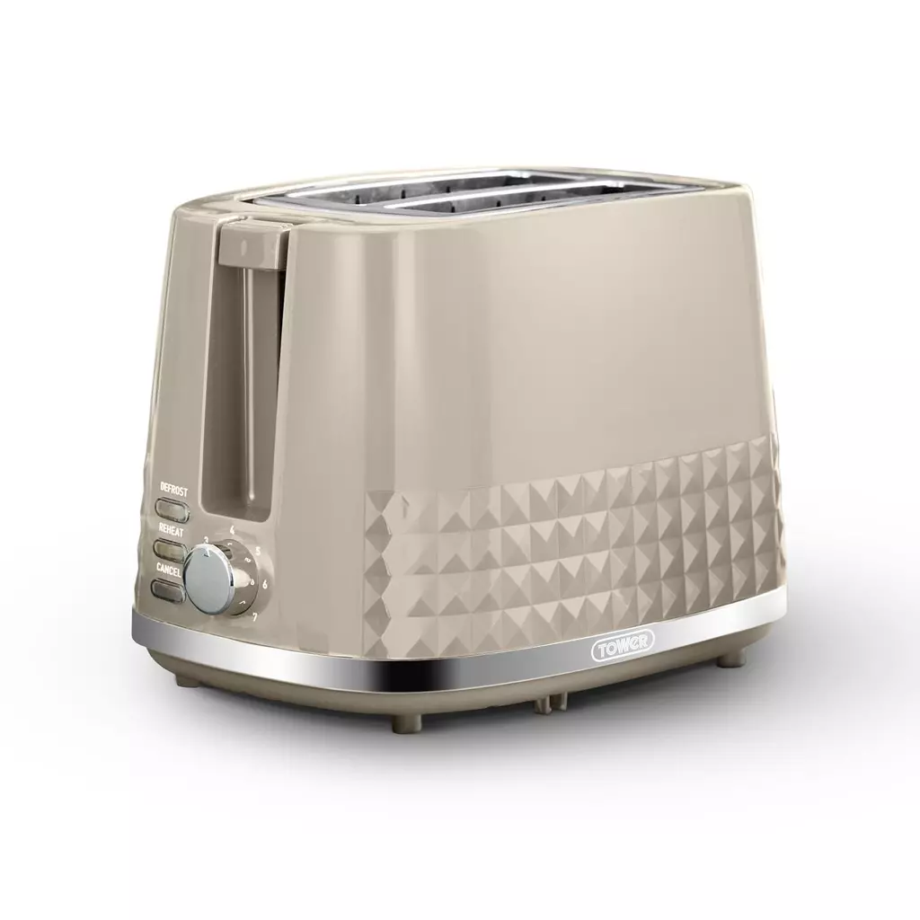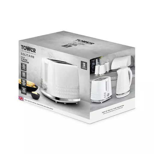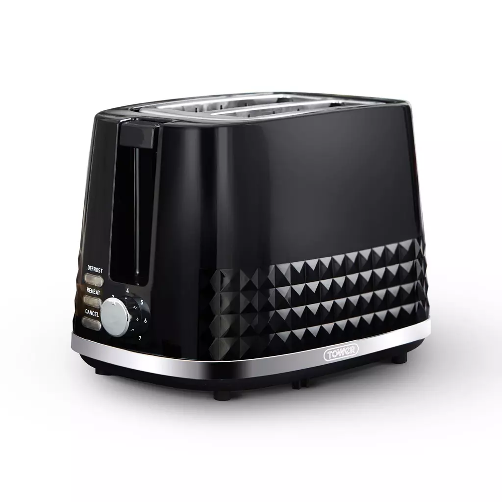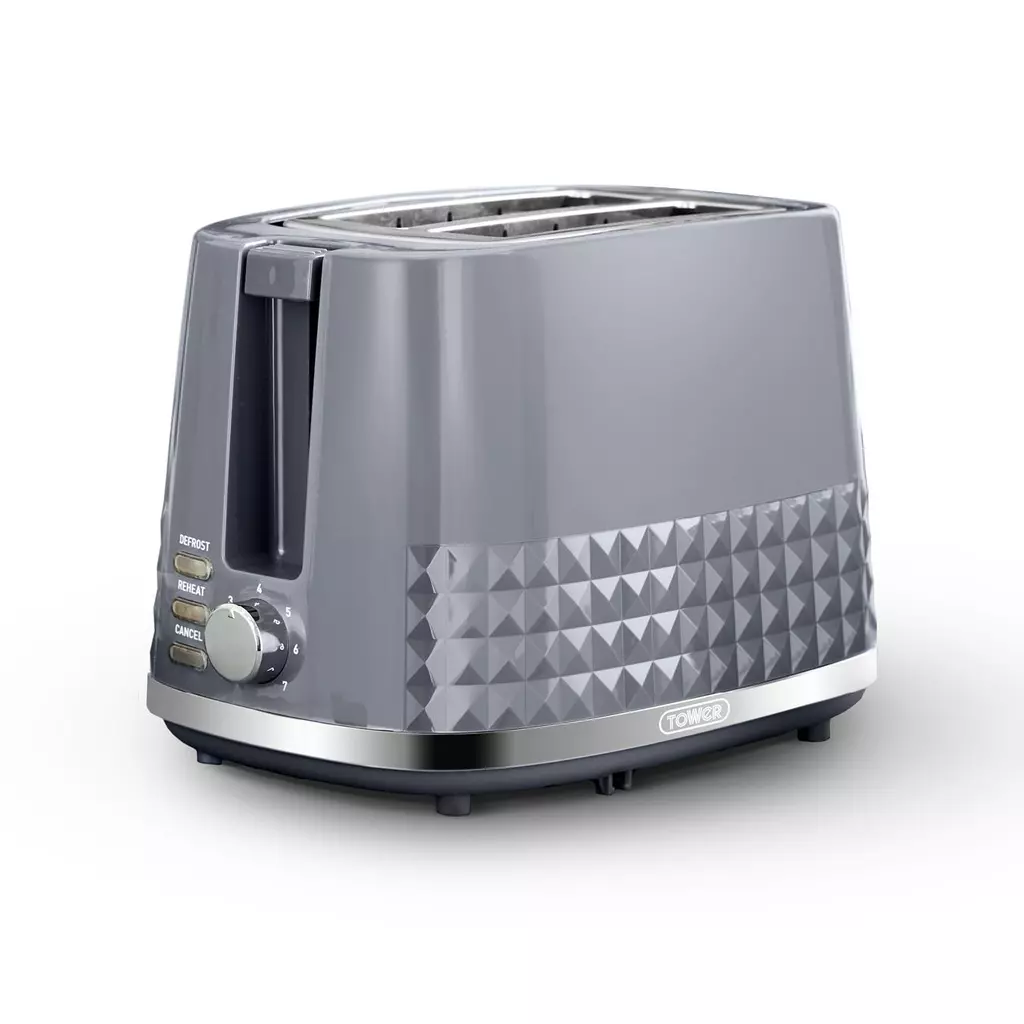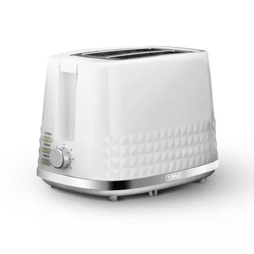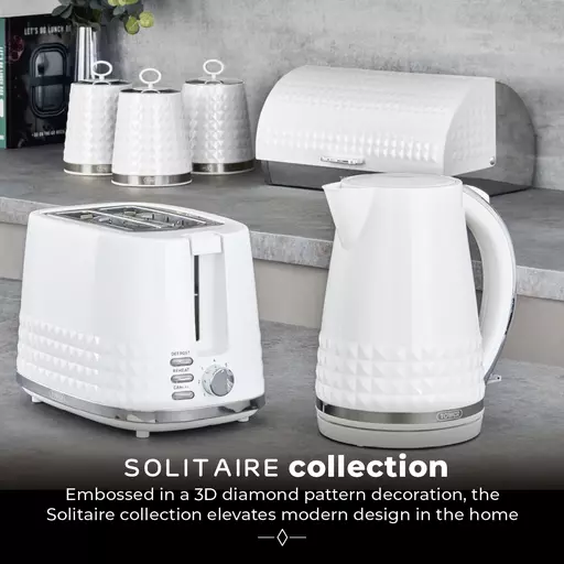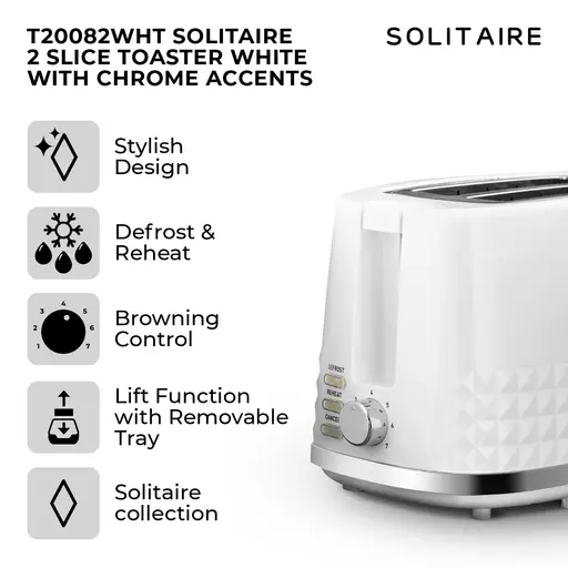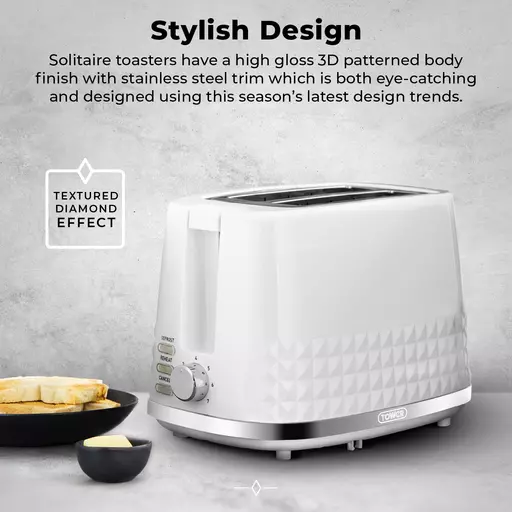 Elevate your kitchen aesthetic with the elegant Tower Solitaire 2-slice toaster. Embossed in a 3D diamond pattern decoration, the Solitaire collection elevates modern design in the home,  The functional toaster provides 2 slots with enough space to fit bread and snacks of varying sizes. It uses adjustable browning control with 7 settings for selecting your ideal consistency and crunch. A self-centring function ensures you always get crisp, even results with each slice. There are options for defrost and reheat, allowing you to toast bread from frozen for a quick breakfast solution. A removable crumb tray and integrated cord storage to keep your surfaces clean and tidy.Â