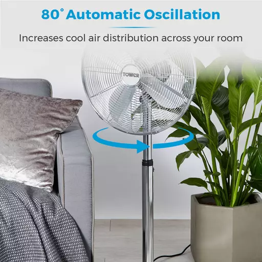 This 16 inch pedestal fan from Tower is easy to assemble and the perfect addition to your home or office space. It features 3 variable speed settings – low/medium/high – which is just what you need to keep you comfortably cool in different climates. The 90 degree oscillation, adjustable height and tilt functions provide the flexibility needed to ensure the airflow is directed exactly where you need it to. This fan has been designed with convenience in mind thanks to the handy integrated carry handle, which makes for easy movement. Featuring a topple resistant base and anti-slip rubber feet; it helps avoid the risk of the pedestal fan falling over.