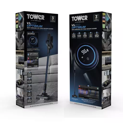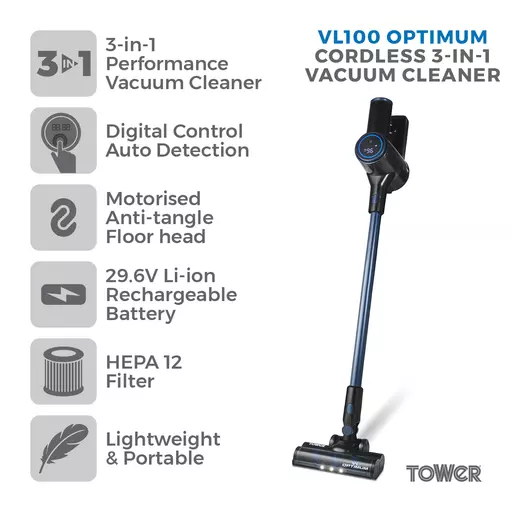 The VL100 Optimum Cordless 3-in-1 Pole Vacuum is a 29.6v DC motored vacuum cleaner boasting a powerful 11kpa suction power with a 1L dust tank. Converting into a handheld vacuum, it is perfect for staircases, cars and upholstery. Among its many features, there is a touch-sensitive LED control panel with 4 power modes, which allows the suction power to be adjusted. It also has an impressive auto suction mode with dust sensor technology, which continuously detects dust particles that will automatically increase suction power for higher dust levels.Â