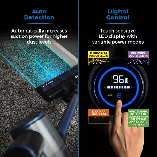 Touch sensitive LED display with 4 power modes, including auto suction mode. Dust sensor technology continuously detects dust particles, automatically increasing suction power for higher dust levels with the LED display showing up hidden dust and debris