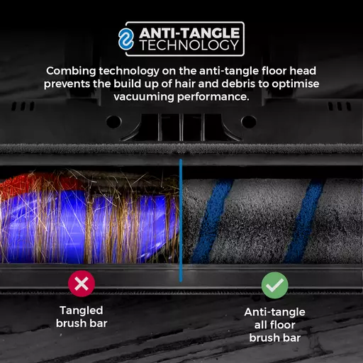 The 3-in-1 floor head includes an anti-tangle brush head, which prevents hairs from tightly wrapping around the brush bar, ensuring continuous smooth running. Â As the vacuum weighs only 2.5kg, it is highly manoeuvrable and boasts a battery with an impressive up to 60 minutes of runtime from a single charge. The vacuum is easily stored away on its vacuum stand, when no longer required.