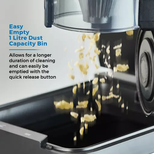 Ultra lightweight 2.5kg body allows the vacuum to be effortlessly manoeuvred around the house.  The vacuum’s generous 1 litre dust tank is easily emptied with a one-touch button release mechanism and when the cleaning is complete, the vacuum is easily stored away on its stand