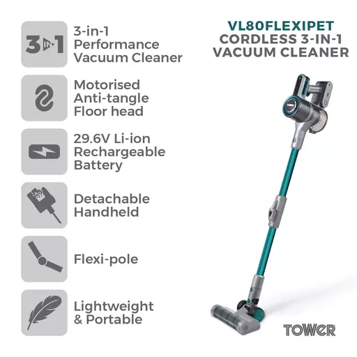 The VL80 is a 29.6V Li-ion DC motored vacuum cleaner boasts a powerful 11kpa suction power with a 75cm flexi pole and a 1L dust tank. Â This product benefits from an anti-tangle floor head and integrated 3-in-1 all floors brush bar and a touch power mode to adjust your suction power. An F8 Multi cyclonic filter system coupled with a secondary Hepa-12 filter allows for this vacuum to agitate dust no matter how deeply imbedded it is. Â This vacuum cleaner also comes with your standard crevice tool and upholstery tool accessory. Â This product benefits from an anti-tangle floor head, preventing hair build up around the brush bar. The vacuum has a lightweight design and good manoeuvrability with up to 40 minutes of runtime from a single charge. It also converts into a handheld vacuum that is perfect for staircases, cars and upholstery. An anti-allergy HEPA filter removes 99.95% of fine particles from 0.3 microns, making it ideal for allergy sufferers. Â