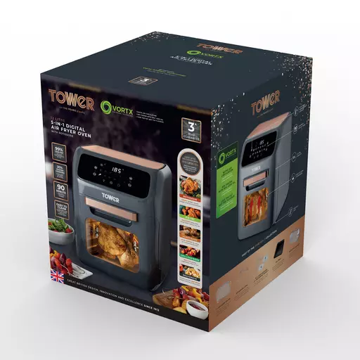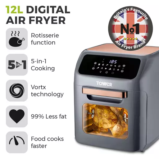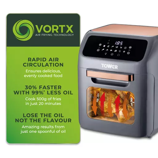 Fry, roast, grill or bake your way to deliciously healthy meals with the Tower 12L Digital Air Fryer Oven. Utilising Vortx technology, the hot air rapidly circulates evenly ensuring your ingredients are cooked thoroughly with a crispy texture. Little to no oil is required, all while keeping the same great taste, so you lose the fat not the flavour.