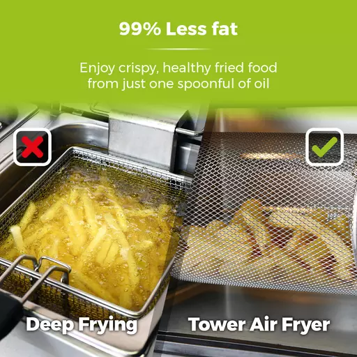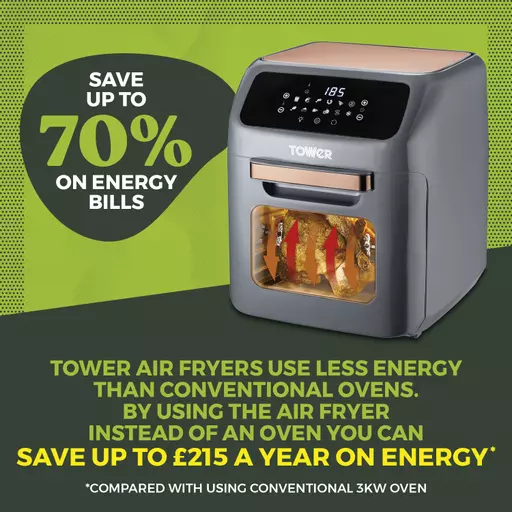 Cooking food 30% faster, Tower Air Fryers use less power than conventional ovens. Save up to 50% on your energy by simply switching to Air Fryer cooking