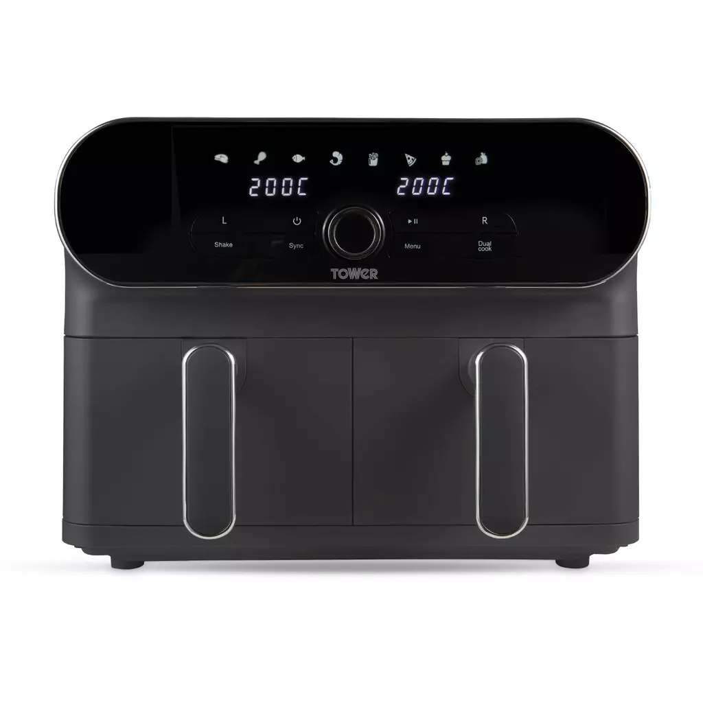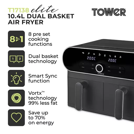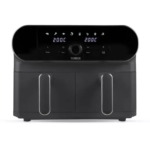 Cook larger meals for the whole family with this 10.4L Dual Basket Air Fryer from Tower. Two 5.2L baskets will cook food independently with individual timers and temperature settings for larger portions or cooking multiple food types at once. Featuring Vortx technology, food will cook 30% faster than in a conventional oven, for delicious crispy meals that requires little to no oil. Use the Sync function to set different foods to cook and be ready at the same time, whilst the intelligent Dual Cook function will synchronise cooking settings for cooking larger portions of food. Choose from 8 cooking presets including Steak, Drumsticks, Fish, Prawns, Fries, Pizza, Cake and Dehydrate for fuss free cooking, whilst the digital control panel makes it simple to cycle through cooking settings and temperatures. The letters SHK will appear on the display two thirds of the way before cooking, reminding you to shake the basket for a more thorough and even cook. Non-stick removable grill plates offer simple cleaning so cooking is fuss-free from start to finish.